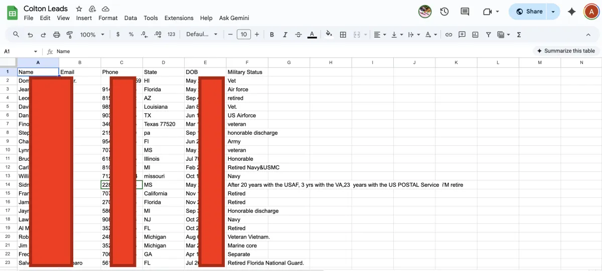 Data Points: Name, Email, Phone, Age, Beneficiary - could include Military Status (it's variable, facebook is harsh when we ask this).